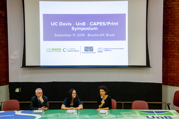 Pesquisadores da instituição norte-americana participaram de simpósio na UnB. Negociação para formalizar acordo de cooperação foi iniciada. “Docentes e estudantes da UnB puderam ter contato com convidados da UC Davis, especialistas em temáticas como dermatologia, mudanças climáticas, agricultura, câncer, controle de arboviroses. Foi uma oportunidade para incrementar novas parcerias”, relata prof. Laila Espindola, docente do curso de Farmácia e coordenadora do Programa de Pós-Graduação em Ciências Médicas da Faculdade de Medicina (FM). Professor Walter Leal, da UC Davis, decana de Pós-Graduação, Adalene Moreira, e professora Laila Espindola, da UnB, durante simpósio na FS. Foto: Luis Gustavo Prado/Secom UnB Matéria completa em: https://noticias.unb.br/74-internacional/3186-parceria-com-a-universidade-de-california-em-davis-amplia-oportunidades-internacionais