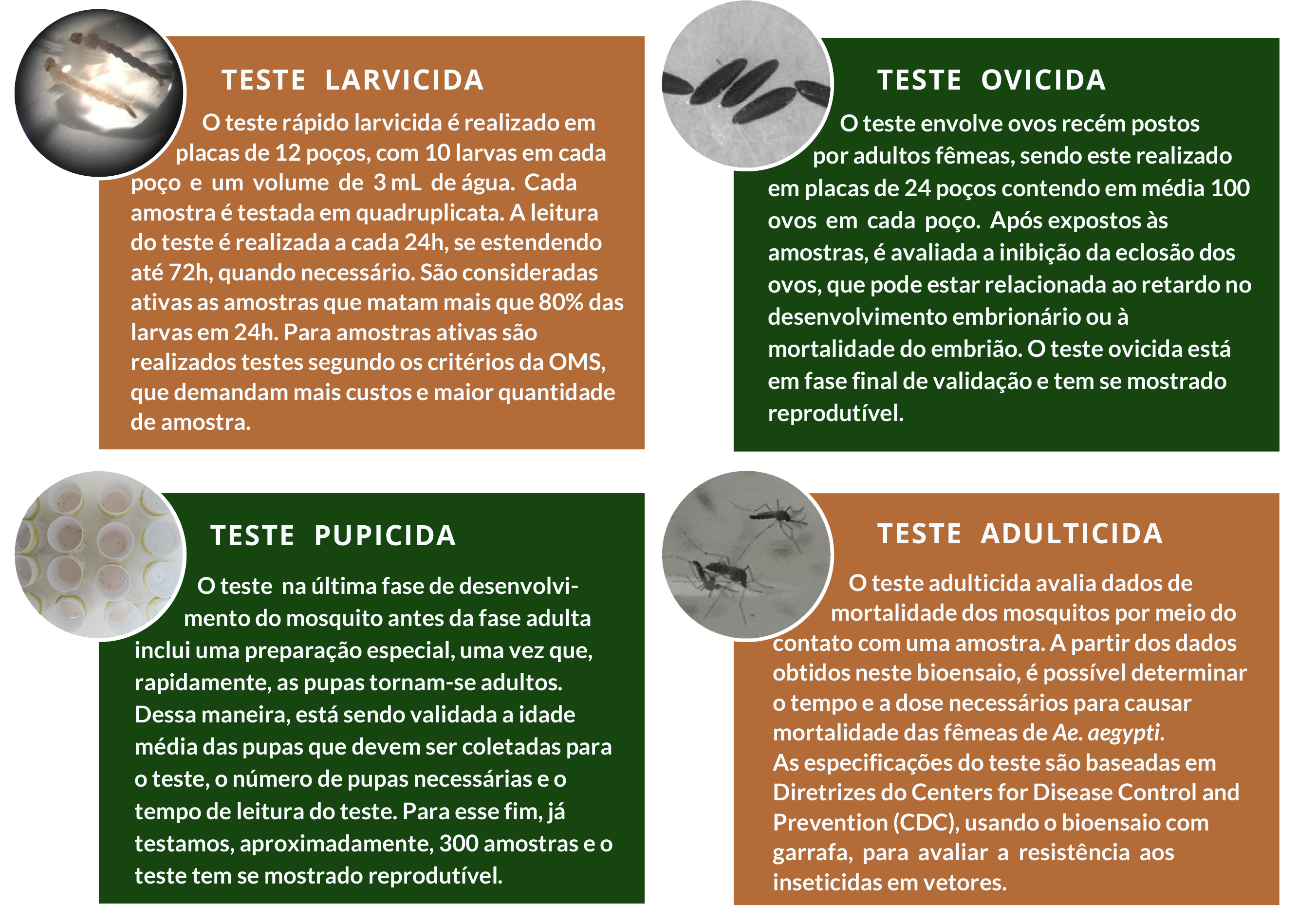 A manutenção de colônias do mosquito Aedes aegypti envolve a coleta de ovos, a eclosão de suas larvas e a criação dos mosquitos até a fase adulta. Esse trabalho é realizado no insetário ArboControl do Laboratório de Farmacognosia/UnB. Para tanto, faz-se necessária a utilização de ovos com até 3 meses de idade e a sua eclosão com o auxílio de uma bomba de vácuo. Esse procedimento é considerado bem-sucedido quando a taxa de eclosão é maior ou igual a 70%. As larvas devem ser alimentadas com ração de gato ou de peixe até o 8º dia, conforme descrito no POP0009 do Insetário ArboControl do Laboratório de Farmacognosia - UnB. Durante o período larval, por volta do 5º ou 6º dia, são realizados os testes larvicidas. A partir do 8º dia de criação, já é possível obter pupas para a realização de testes pupicidas e para a montagem das gaiolas. As pupas darão origem aos adultos que devem ser alimentados regularmente com açúcar e sangue de animais. Após uma semana, é possível coletar ovos, o que dá origem a um novo ciclo de criação do mosquito. As diversas etapas da manutenção de colônias são realizadas simultaneamente todos os dias, incluindo finais de semana. O insetário possui a temperatura controlada em 28 ºC +/- 2 ºC e a umidade relativa mantida em 70% +/- 10%.